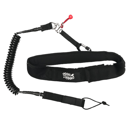 The Ridng not Hiding Coiled SUP leash keeps the leash out of the water whilst paddling on flat water and if you get stuck on a bouy or other object in fast moving water the waist belt is easy to remove velco or with the Quick Release shackle