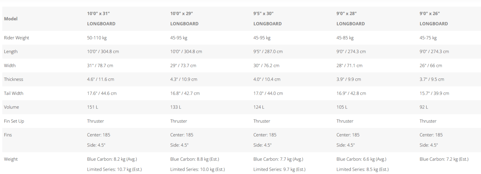 Five sizes to choose from 9'0" x 26" to 10'0" x 31. Three technology options: Blue Carbon for the lightest and strongest performance, with Limited Series Blue and Limited Series offering fantastic value.