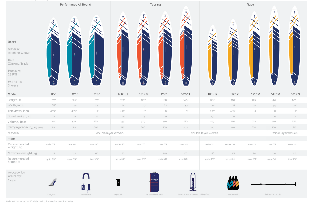 The Touring is 32" x 5.9" wide for the rider wanting a great leisure paddling experience with more stability but with a slightly slower glide.