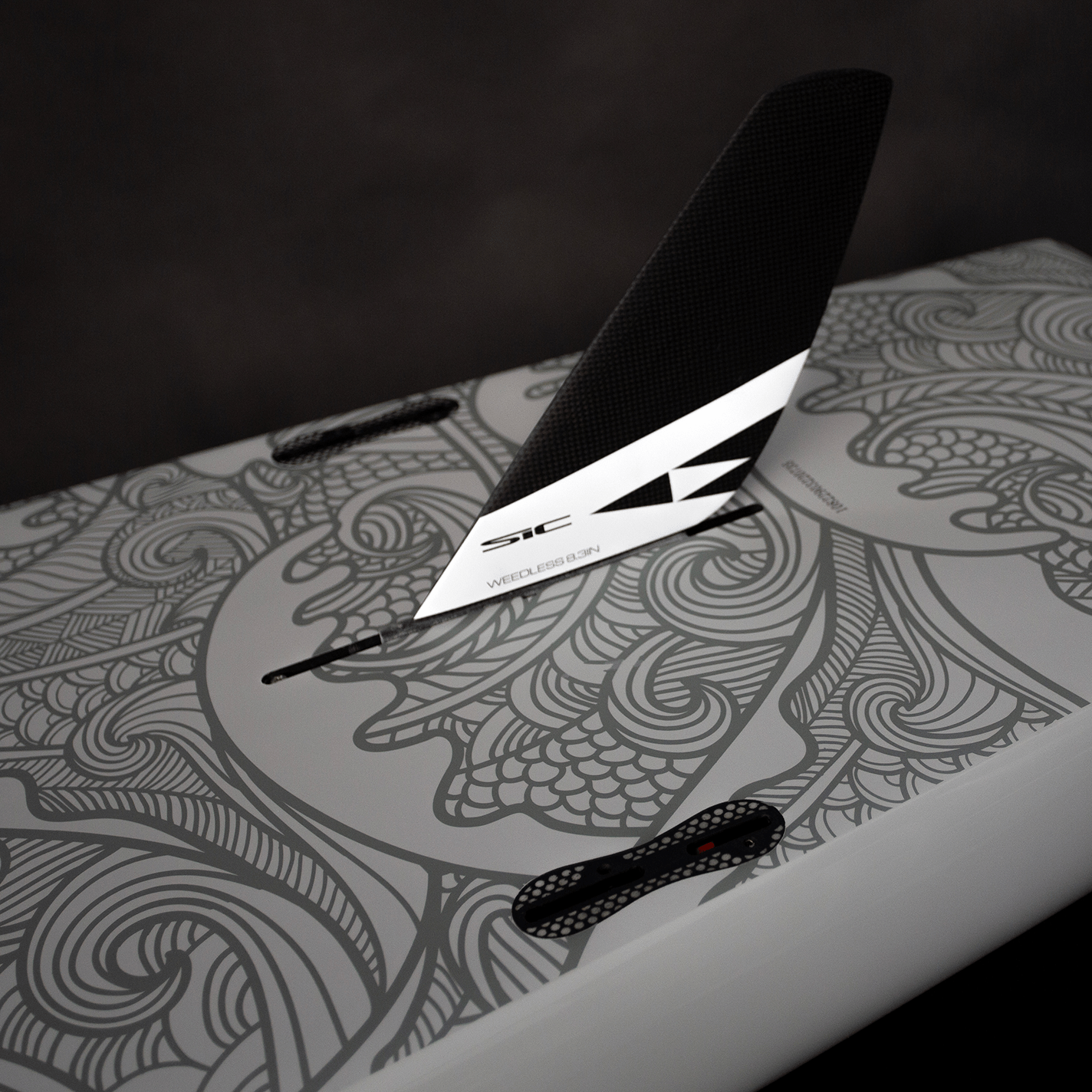 The construction of the SIC Okeanos is built for touring with innegera reinforced rails, nose and tail as well as a beautiful white oak finish over the forward section of the board. The 12'6" Okeanos features numerous gear tie-downs, EVA deck pad, 12k carbon weedless fin, EZ-Grab handle and FCSII thruster boxes which are perfect for cruising in shallow