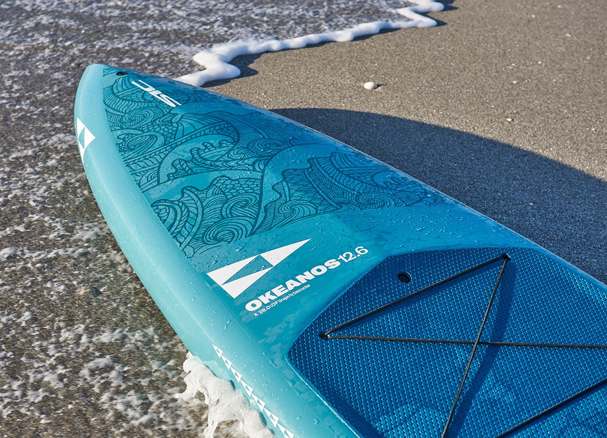 The SIC Okeanos 12'6" is a hugely capable and versatile touring paddleboard from SIC designer Mark Raphoost. takes the refined rocker line and centre channel of the race-proven SIC RS but simply widen it with a more pronounced standing area and defined nose. The result is a rewarding efficient glide in conditions that range from flat calm to a rough water sea state.